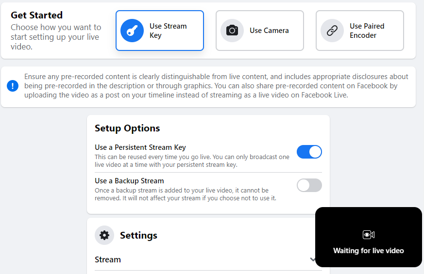 Make sure the "Use Persistent Stream Key" option is enabled in Facebook Live and wait a few seconds.